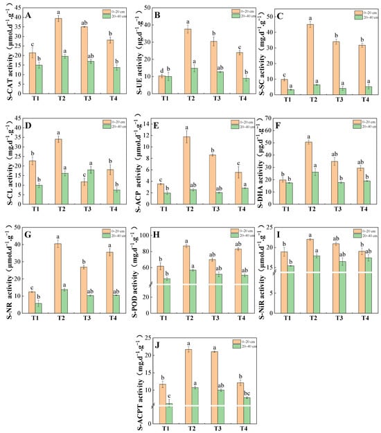 Enzyme activity in soil treated with reduced amounts of inorganic nitrogen and bio-organic fertiliser. Soil samples were taken at 0–20 cm (orange) and 20–40 cm (green) depths. Lowercase letters in the figure represent significant differences between samples from the same soil layer (p < 0.05). (A) soil catalase, (B) soil uretrase, (C) soil saccharase, (D) soil cellulase, (E) soil acid phosphatase, (F) soil dehydrogenase, (G) soil nitrate reductase, (H) soil peroxidase, (I) soil nitrite reductase, (J) soil protease.