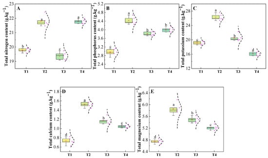 Total elemental content in apple leaves under nitrogen reduction and bio-organic fertiliser treatment. Lowercase letters represent significant differences in the total element content of leaves under different treatments (p < 0.05). The empty and solid dots represent the mean and data points, respectively, and the dashed line is the normal distribution curve fitted to the data points. (A) total nitrogen content, (B) total phosphorus content, (C) total potassium content, (D) total calcium content, (E) total magnesium content.