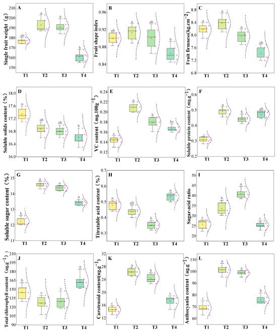Changes in apple fruit quality under nitrogen reduction and biological organic fertiliser treatments. Lowercase letters in the figure indicate significant differences in apple peel colouring coefficient values (p < 0.05). The empty and solid dots represent the mean and data points, respectively, and the dashed line is the normal distribution curve fitted to the data points. (A) single fruit weight, (B) fruit shape index, (C) fruit firmness, (D) toluble solid content, (E) VC content, (F) soluble protein content, (G) soluble sugar content, (H) titratable acid content, (I) sugar–acid ratio, (J) total chlorophyll content, (K) carotenoid content, (L) anthocyanin content.