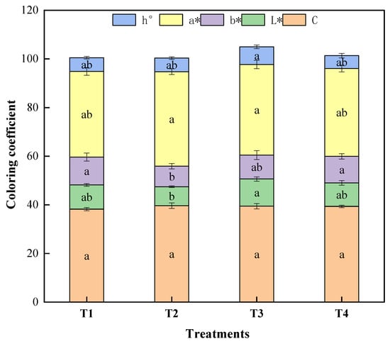 The change in the colouring coefficient of apple peels treated with bio-organic fertiliser (Figure 6). Compared to T1, the skin tone h°, red–green axis a* value, and colour intensity C value of the other treatments did not change significantly. The T2 and T4 treatments decreased the yellow–blue axis b* value by 35.74% and 4.63% and the brightness L* value by 27.80% and 3.11%, respectively.