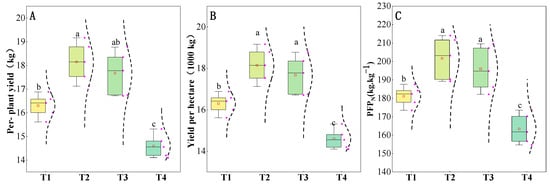 Changes in apple yield under nitrogen reduction and bio-organic fertiliser treatment. Lowercase letters in the figure represent significant differences in yields (p < 0.05). The empty and solid dots represent the mean and data points, respectively, and the dashed line is the normal distribution curve fitted to the data points. (A) per-plant yield, (B) yield per hectare, (C) partial factor productivity from applied N (PFPN).