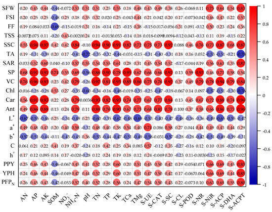 Correlation analysis of apple fruit quality, yield, and soil index. All soil indicators were obtained from 0 to 20 cm soil samples. SFW: single fruit weight, FSI: fruit shape index, FF: fruit firmness, TSS: total soluble solid, TA: titratable acid, SSC: soluble sugar, SAR: sugar–acid ratio; SP: soluble protein, VC: Vitamin C, Chl: chlorophyll, Ant: anthocyanin, Car: carotenoid, L*: brightness, a*: red–green axis, b*: yellow–blue axis, C: colour intensity, h°: tone, PPY: per-plant yield, YPH: yield per hectare, PFPN: partial factor productivity from applied N, AN: alkaline lysis nitrogen, AP: available phosphorus, AK: available potassium, SOM: soil organic matter, NO3−: nitrate nitrogen, NH4-N: ammonium nitrogen, TN: total nitrogen, TP: total phosphorus, TK: total potassium, TCa: total calcium, TMg: total magnesium, S-UE: uretrase, S-CAT: catalase, S-SC: saccharase, S-CL: cellulase, S-POD: peroxidase, S-NR: nitrate reductase, S-NiR: nitrite reductase, S-ACP: acid phosphatase, S-DHA: dehydrogenase, S-ACPT: protease.