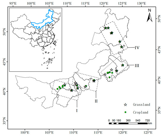 This study area is the agro-pastoral ecotone from Hulunbuir to Bayannur in Inner Mongolia, China (105°53′–115°31′ E, 40°51′–53°20′ N). According to the Land and Spatial Planning of Inner Mongolia Autonomous Region (2021–2035), the agro-pastoral areas along the Yellow River mainstream plain (I), the foothills of Yinshan Mountain (II), the West Liaohe River Basin (III), and the foothills of Daxing’an Mountains (IV) are, respectively, located from west to east.
