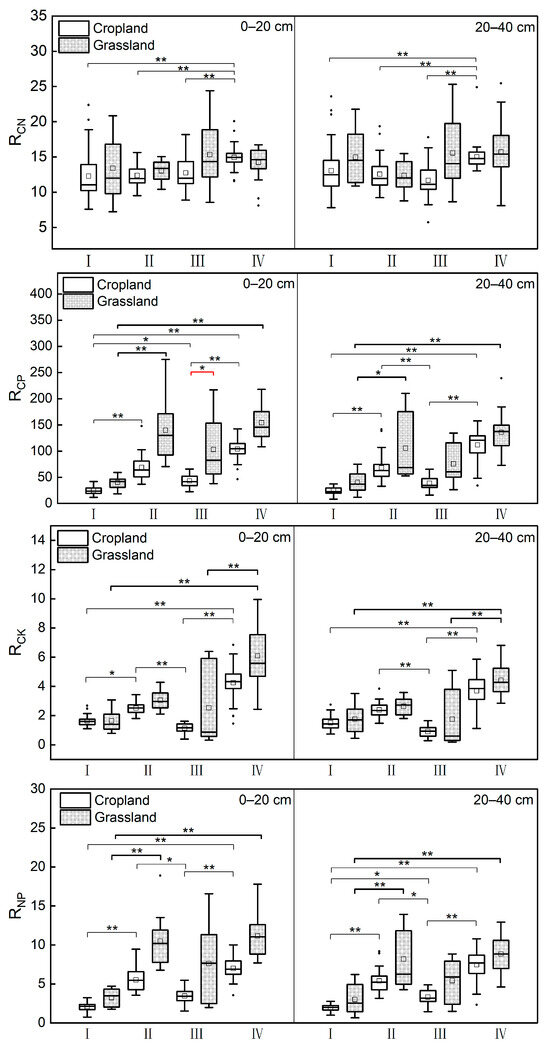 Box map of the eco-stoichiometric ratio of soil C, N, P, and K in 0–20 cm and 20–40 cm soil layers in four agro-pastoral areas. RCN, RCP, RCK, RNP, RNK, and RPK stand for ratios of C:N, C:P, C:K, N:P, N:K, and P:K, respectively. Thin lines represent the comparison of farmlands in different regions; thick lines indicate the comparison between grasslands in different regions; and red lines represent the comparison between farmland and grassland in the same region. The dots represent outliers and the boxes represent the mean value. The difference between treatments was analyzed using a Kruskal–Wallis test; * and ** denote significant differences at 0.05 and 0.01 probability levels.