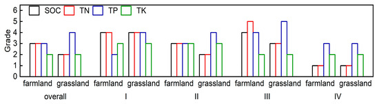 Regarding the overall scale of agro-pastoral ecotone in Inner Mongolia, the SOC and TN levels of farmland were lower than those of grassland, but the level of TP was higher, the farmland nutrients were at a middle level, and the level of grassland was at an upper-middle level. The level of TP in farmland in areas I, II, and III was higher than that in grassland, while the levels of SOC and TN in areas II and III were lower than those in grassland. The nutrient level of area III was at the middle and lower levels, and the nutrient level in area IV was the highest (Figure 4).
