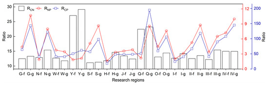 Comparison of soil C:N:P in this research and other study regions. RCN, RCP, and RNP stand for ratios of C:N, C:P, and N:P, respectively; f and g mean farmland and grassland soil, respectively. G, N, W, Y, S, H, J, Q, and O refer to global level [34], northwest agro-pastoral ecotone [35], windy and sandy areas of northern China [25], agro-pastoral area at the northern foot of Yinshan Mountain [36], Horqin sandy land [24], Hebei province [37], yellow soil area of western Shanxi [38], eastern Qinghai Province [39], and the overall scale of this study, respectively. I, II, III, and IV refer to the four areas in this study.