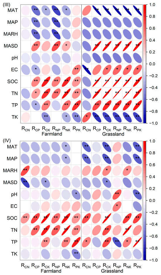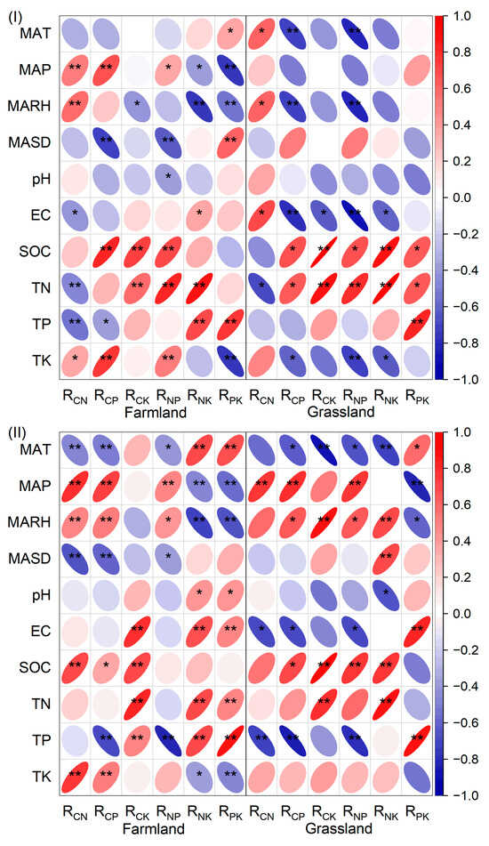 Spearman correlation of soil stoichiometry with nutrient content and environmental factors of farmland and grassland in four agro-pastoral areas. The red oval indicates a positive correlation, blue indicates a negative correlation, a darker color and narrower shape refers to a greater correlation coefficient. MAT, MAP, MARH, and MASD stand for annual mean temperature, annual mean precipitation, annual mean relative humidity, and annual mean sunshine duration from 1981 to 2021, respectively. pH and EC refer to the pH and electric conductivity values of soil. SOC, TN, TP, and TK stand for the organic carbon, total nitrogen, total phosphorus, and total potassium contents of soil. * and ** denote significant differences at 0.05 and 0.01 probability levels.
