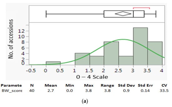The recorded scores for BW resistance in the 40 tomato accessions had an average value of 2.7, a standard deviation (Std Dev) of 0.9, a standard error (Std Err) of 0.14, and a coefficient variation (CV) of 33.5% (Figure 3a). These statistics suggest that the population had a large range (3.8) and variation (0.9 Std Dev and 33.5% CV) in BW resistance. Among the 40 genotypes, the top five genotypes with a score of 0 or an average mean of <1.5 demonstrated great levels of BW resistance, showing their potential to be used in breeding programs targeting the development of new cultivars or lines with BW resistance.