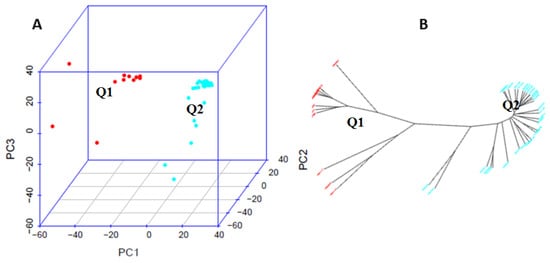 A PCA was conducted for 39 of the 40 tomato accessions (except PI 279565 listed in Table 1). The 39 accessions were divided into two distinct clusters or sub-populations, represented by red (Q1) and blue (Q2) colors in both the PCA plot (Figure 4A) and phylogenetic tree (Figure 4B) based on the neighbor-joining (NJ) algorithm in GAPIT 3. The Q2 sub-population was the majority with 28 accessions, accounting for 71.8% of the total population, and Q1 had 11 accessions (28.2%) (Table 1, Figure 4).