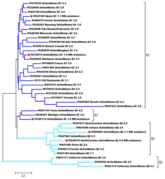 Two distinct clusters were also observed among the 39 tomato accessions in the phylogenetic tree postulated using the Maximum Likelihood (ML) method in MEGA 7 (Figure 5). The top five greatly BW-resistant accessions, namely PI 645370, PI 647305, PI 600993, PI 355110, and PI 270210, were arranged into the two clusters (Q1 and Q2) marked red and square-shaped in Figure 5 and Table 1 with the accession information, indicating a different genetic base (background). Interestingly, despite most of the accessions in the study originating from the USA, the genotype diversity analysis revealed diverse genetic differences among the USA accessions, among different countries, and among USA states (Figure 5). Four of the five resistant accessions were originally collected from the United States of America, while one was collected from Spain (Table 1 and Figure 5). This highlights the availability of genotypes that are resistant to the R. solanacearum isolate P822, which is common in the USA. The sup-population Q1 contains three BW-resistant accessions, namely two from the USA and one from Spain, and the Q2 has two BW-resistant accessions from the USA. This information can be used to identify and utilize BW-resistant genotypes in breeding programs to develop more resilient tomato crops.