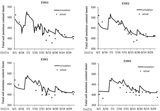 In addition, in the case of water replenishment, the simulated values are relatively closer to those of the measured data. This result shows that AquaCrop has high sensitivity for simulating the process of water movement in soil. If our suppositions about the possible reasons for the two above-mentioned differences are correct, we can more accurately determine whether the belief that the measured values are relatively close to the simulated values under water replenishment conditions is true, because there is a certain gap between the actual soil structure and the simulated soil structure, generating relatively accurate simulation results in a very short period of time, yet gradually producing differences over time. The measured total soil moisture content under the three pre-sowing irrigation conditions were higher than the simulated values, while the measured values under rain-fed conditions were lower than the simulated values, validating the above claims to some extent.