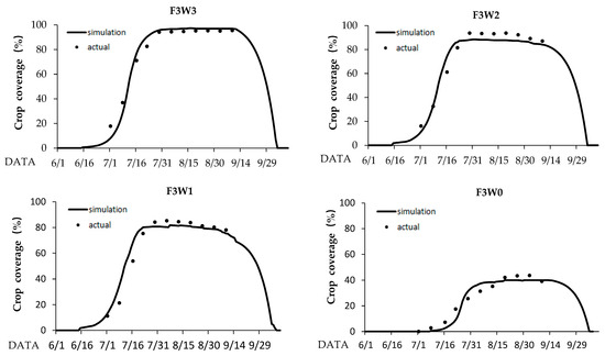 From the experimental results (Figure 3), we can see that AquaCrop has a good simulation effect for simulating crop coverage (CC). The calibration and validation of this manuscript are based on crop coverage, meaning that in this part of the results, the relative fit between the simulated and measured values is relatively high. When calibrating the model, the F3W3 treatment was used as the benchmark, meaning that the validation result had the highest fit when using this treatment. For other treatments, although the fit was less good than that of the F3W3 treatment, it was within an acceptable range. After verification, the correctness of this result was also proven. Therefore, model calibration can provide guidance for agricultural production in the experimental area by applying the model to practical tasks. For the F3W0 treatment, due to the rain-fed conditions, the results were more affected by climatic conditions, resulting in the lowest fit of the four treatments. The main reason for the significant difference was that the model was unable to simulate extreme weather, while the target area was conducted in a field environment during this experiment, which could not prevent interference from natural events such as strong winds. Moreover, extreme weather cannot be expressed through models, as it leads to significant differences. However, in the actual production process, the probability of extreme weather occurrence is relatively low, and although extreme weather occurred during this experiment, the simulation results are within an acceptable range. Therefore, although AquaCrop cannot temporarily negate the impact of extreme weather, this weather does not affect the simulation’s accuracy. It should be noted that in areas where extreme weather events frequently occur, it is not recommended to use AquaCrop for data acquisition.