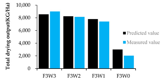 The 2018 output simulation results (Figure 4) show that the simulated value of the final total dried yield of summer maize basically conforms to the measured value, while the value of the total dried yield of summer maize under each water treatment conforms to the actual situation in the field. The difference in the total dried yield when using the rain-fed treatment is obvious. The summer climate in the test area in 2018 was an extreme outlier, with little rainfall and frequent strong winds being recorded, while the plants in the rain-fed treatment were prone to collapse; the model cannot take this factor into account. Therefore, the predicted value is much higher than the measured data. The results of Shirazi et al. [35] showed that AquaCrop has a deviation of no more than 11% when simulating summer maize yield and biomass, similar to the results of this study. This result is also similar to the research findings of Thamer [36] and Ran [37].