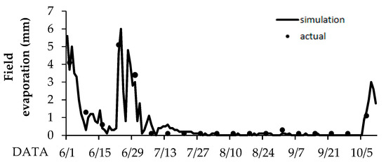 The simulation results of crop canopy coverage in 2018 showed that, when simulating the change trend of crop coverage in the whole summer maize-growing process, the simulated change trend was basically consistent with the measured change trend, and the evaluation index values were all in the range of good applicability, proving that the model had good applicability in the summer maize-planting process in the North China Plain. This result is also similar to the research findings of Abdalhi [29], Jin [33], and Kim [34], as the model is unable to make a comprehensive response to the impact of extreme weather, but it is generally in line with crop growth conditions, and the difference in evaluation index values are within an acceptable range, meaning that they do not affect the use of the model (Table 5).