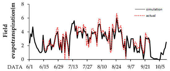 Before using the model, the model parameters had to be calibrated and verified based on the measured data of the meteorological, soil, and irrigation systems, the field management measures, and the original soil moisture content of the test target area. In this study, the measured field data generated at the test site in 2017 were used to calibrate the model, and the parameters of the basic model used in this test were obtained (Table 3).