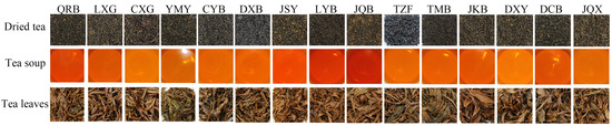 Appearances of the dried tea, tea soup, and tea leaves of the tea samples.