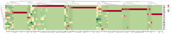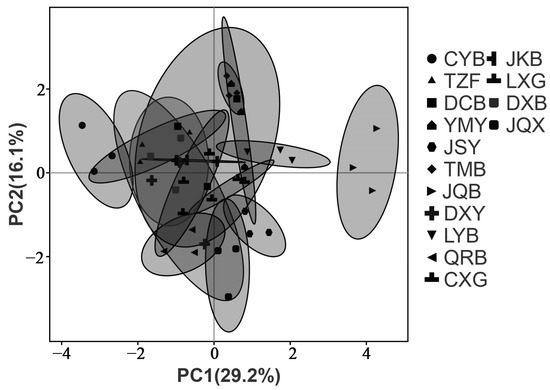 Volatile substances with VIP values exceeding 1 were utilized for the cluster analysis of 15 tea companies. Notably, 10 tea companies (LXG, QRB, DXB, JSY, LYB, JQB, TZF, JQX, JKB, DXY) exhibited similar characteristics (Figure 5), indicating that the Taishan black tea samples from these companies shared a relatively similar volatile profile. Conversely, the black tea samples from the remaining five companies displayed significant differences. Moreover, the sample size of the 10 companies accounted for 66.67% of the total sample size, surpassing the 50% mark. Consequently, the samples from these 10 companies were selected for the PCA, aiming to further identify and screen the key volatile components.