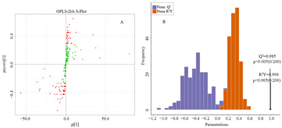 OPLS-DA prediction model. (A), OPLS-DA S-plot; (B), prediction model. The red dots indicate that the VIP values of these volatile substances were greater than or equal to 1, and the green dots indicate that the VIP values of these volatile substances were less than or equal to 1.