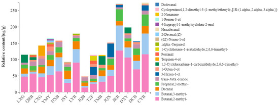 3-methylbutyraldehyde, 2-methylbutyraldehyde, capric aldehyde, isobutyraldehyde, 1-octene-3-ol, and β-ionone were consistently detected in most samples, demonstrating high OAVs. These six types of volatile substances imparted fruity, caramel, sweet, green, and flowery flavor aromas, respectively. Moreover, the relative content of these key volatile components confirmed their prominence (Figure 6), with consistently high relative concentrations across the samples.