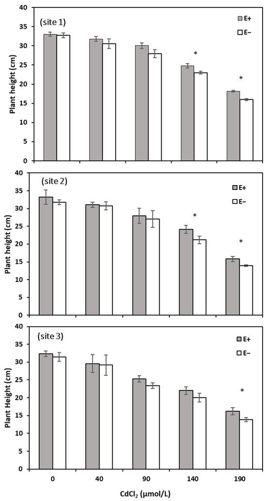 Plant height of E. dahuricus infected with E. bromicola grown under different CdCl2 treatments. Seeds were collected from Qinghai Tongren (Site 1), Qinghai Zeku (Site 2), and Qinghai Gonghe (Site 3). * indicated significant difference between E+ and E− at 0.05 level.