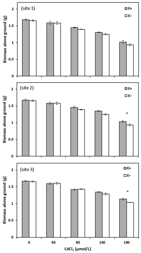 Biomass above ground of E. dahuricus infected with E. bromicola grown under different CdCl2 treatments. Seeds were collected from Qinghai Tongren (Site 1), Qinghai Zeku (Site 2), and Qinghai Gonghe. * indicated significant difference between E+ and E− at 0.05 level.