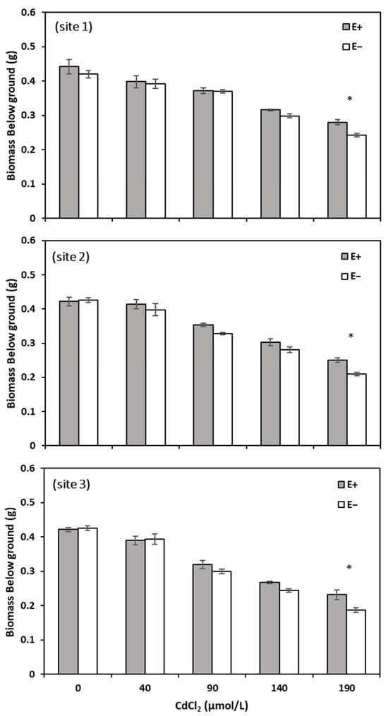 Biomass below ground of E. dahuricus infected with E. bromicola grown under different CdCl2 treatments. Seeds were collected from Qinghai Tongren (Site 1), Qinghai Zeku (Site 2), and Qinghai Gonghe. * indicated significant difference between E+ and E− at 0.05 level.