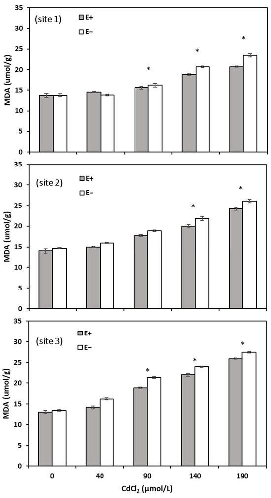 MDA content of E. dahuricus infected with E. bromicola grown under different CdCl2 treatments. Seeds were collected from Qinghai Tongren (Site 1), Qinghai Zeku (Site 2), and Qinghai Gonghe. * indicated significant difference between E+ and E− at 0.05 level.