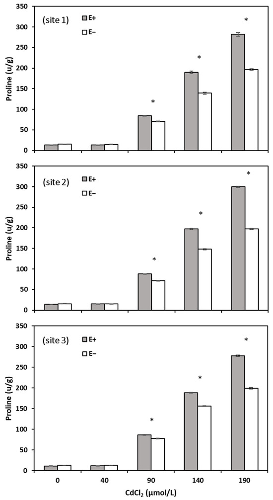 Proline content of E. dahuricus infected with E. bromicola grown under different CdCl2 treatments. Seeds were collected from Qinghai Tongren (Site 1), Qinghai Zeku (Site 2), and Qinghai Gonghe. * indicated significant difference between E+ and E− at 0.05 level.