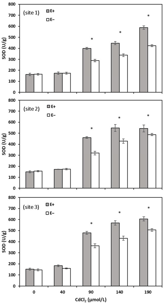 SOD activity of E. dahuricus infected with E. bromicola grown under different CdCl2 treatments. Seeds were collected from Qinghai Tongren (Site 1), Qinghai Zeku (Site 2), and Qinghai Gonghe. * indicated significant difference between E+ and E− at the 0.05 level.