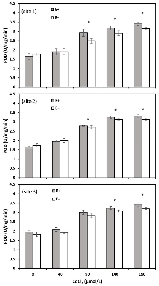 POD activity of E. dahuricus infected with E. bromicola grown under different CdCl2 treatments. Seeds were collected from Qinghai Tongren (Site 1), Qinghai Zeku (Site 2), and Qinghai Gonghe. * indicated significant difference between E+ and E− at 0.05 level.