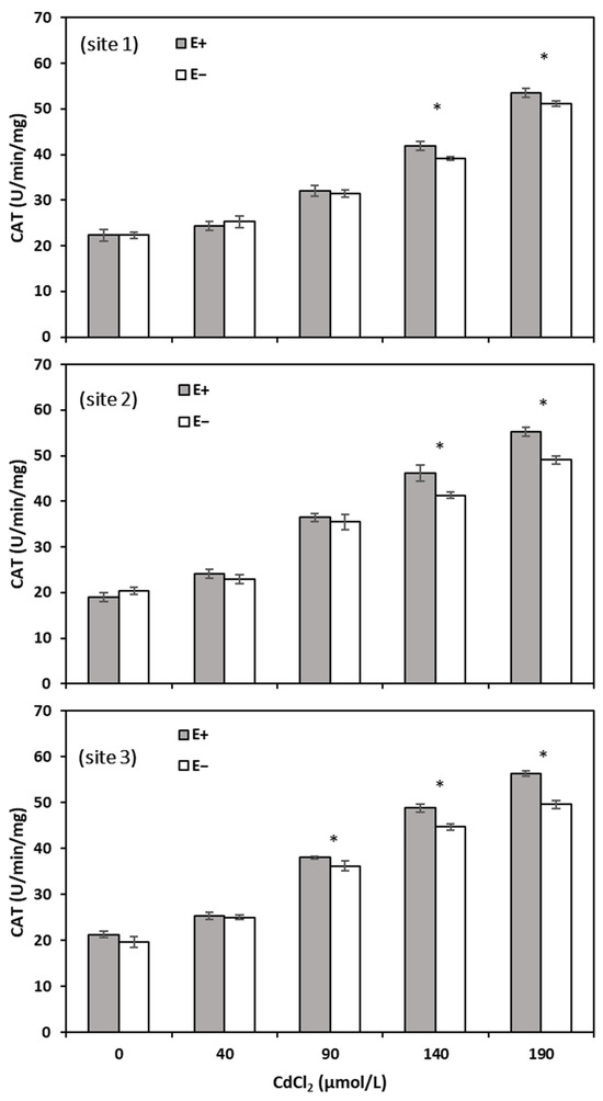CAT activity of E. dahuricus infected with E. bromicola grown under different CdCl2 treatments. Seeds were collected from Qinghai Tongren (Site 1), Qinghai Zeku (Site 2), and Qinghai Gonghe. * indicated significant difference between E+ and E− at 0.05 level.