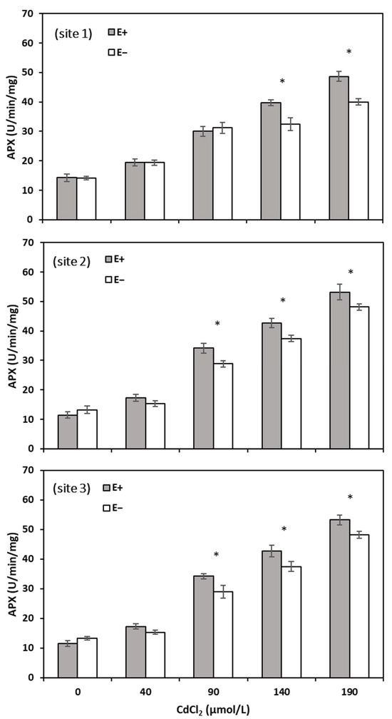 APX activity of E. dahuricus infected with E. bromicola grown under different CdCl2 treatments. Seeds were collected from Qinghai Tongren (Site 1), Qinghai Zeku (Site 2), and Qinghai Gonghe. * indicated significant difference between E+ and E− at 0.05 level.