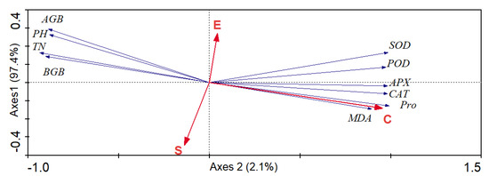 The result of PCA analysis among Cd concentration, Epichloë, site, plant growth, and antioxidant capacity. Note: AGB indicated aboveground biomass; PH indicated plant height; TN indicated tiller number; BGB indicated belowground biomass; S indicated site; E indicated Epichloë bromicola; C indicated Cd concentration; Pro indicated proline.