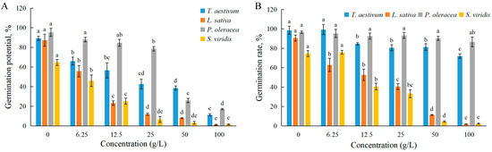 Germination potential (A) and germination rate (B) of four plant seeds under treatment with EPF. The results presented are mean of three replicates ± SE; different letters denote significant differences at p < 0.05 according to one-way ANOVA with an LSD test.