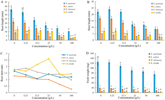 Seedling growth of four plants under treatment with EPF. (A), Root length; (B), Stem length; (C), Root stem ratio; (D), Fresh weight. The results presented are mean of three replicates ± SE; different letters denote significant differences at p < 0.05 according to one-way ANOVA with an LSD test.