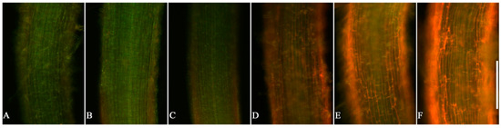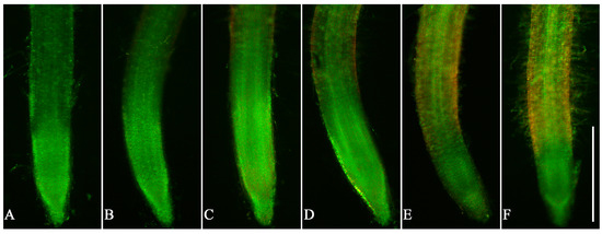 Cell viability in lettuce root tips after treatment with EPF. Lettuce seedlings were treated with EPF at concentrations of (A) 0, (B) 6.25, (C) 12.5, (D) 25, (E) 50 and (F) 100 g/L for 48 h. Roots were stained with FDA/PI. Green fluorescence and red fluorescence indicate viable and dead cells in root tips, respectively. Bar = 500 μm.