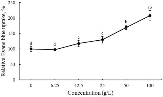 The ratios of dead cells in lettuce root were further quantified by determination of Evans blue uptake. The results show that the relative uptake of Evans blue by lettuce roots at 6.25 g/L of EPF was similar with that of the controls. However, when the concentration reached 12.5 g/L and higher, the relative uptake of Evans blue was significantly higher than that of the controls (Figure 4). The results are in accord with the fluorescence staining experiment.