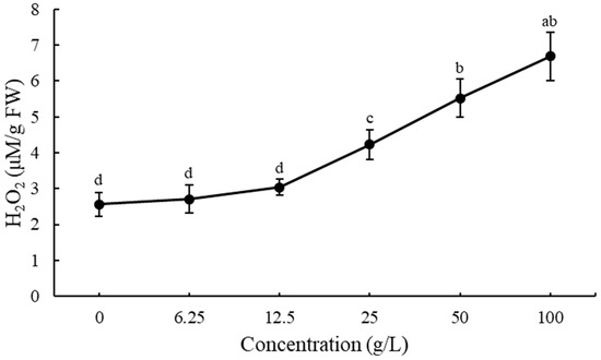 H2O2 is a common ROS that is closely related to oxidative stress in plants. After treatment with EPF, the H2O2 content in lettuce was gradually raised with the increased concentration (Figure 6). When the concentration of EPF reached 25 g/L, the content of H2O2 was significantly higher than that of the controls.