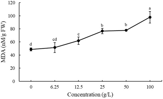 MDA is the product of lipid peroxidation. The content of MDA in lettuce seedlings under 6.25 g/L of EPF did not increase significantly compared with the control group but reached a significant level at 12.5 g/L and higher. At the highest treated concentration of 100 g/L, the content of MDA increased by 100.92% compared with the control group (Figure 7).