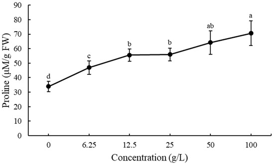 Proline content in roots of lettuce seedlings after treatment with EPF. The results presented are mean of three replicates ± SE; different letters denote significant differences at p < 0.05 according to one-way ANOVA with an LSD test.