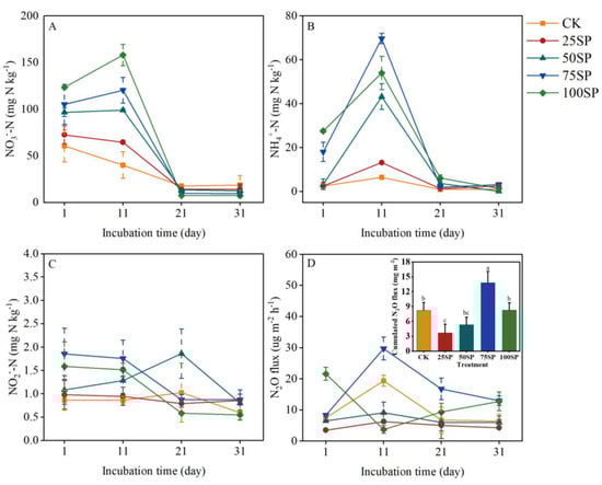The N2O fluxes of all the treatments showed an increasing and then a decreasing trend, except for 100SP, which showed a decreasing and then an increasing trend (Figure 1D). Compared with the CK treatment (8.2 mg m−2), the accumulated N2O emissions significantly reduced by 55.4% for the 25SP treatment (3.7 mg m−2) and significantly increased by 67.8% for the 75SP treatment (13.8 mg m−2). N2O was significantly positively correlated with NH4+-N and EC, while NH4+-N was significantly negatively correlated with C/N and significantly positively correlated with NO3−-N, NO2—N, and EC (Table 2, p < 0.05).