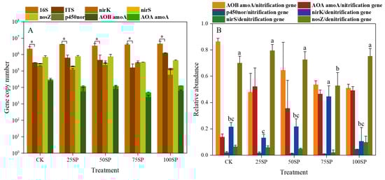 Gene copy number of 16S rRNA and ITS, AOB amoA, AOA amoA, nirK, nirS, nosZ, and p450nor (A) and the relative abundance of AOB amoA, AOA amoA, nirK, nirS, nosZ, and p450nor (B) in different treatments. * represents a significant difference between genes. Different alphabets represent significant differences in one-way ANOVA among treatment groups.
