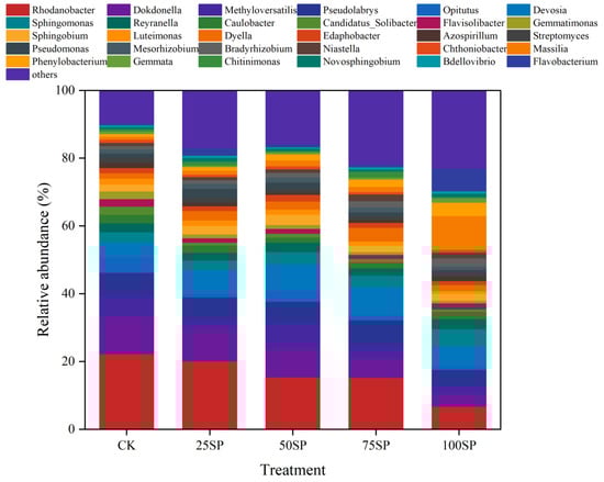 This study analyzed the microbial community composition at the genus level using high-throughput sequencing (Figure 3 and Figure 4C). The results showed that the proportion of denitrifying bacterial genera was 98.1%, 98.0%, 98.0%, 97.7%, and 97.8% for the CK, 25SP, 50SP, 75SP, and 100SP treatments, respectively. The dominant genera in the CK, 25SP, and 50SP treatments were Rhodanobacter and Dokdonella, and their relative abundance was 22.2% and 10.9%, 20.1% and 9.6%, 15.4% and 8.83%, respectively. Meanwhile, in the 75SP and 100SP treatments, the denitrifying dominant genera were Rhodanobacter (15.3%), Devosia (8.3%) and Massilia (10.0%), and Rhodanobacter (6.8%), respectively.
