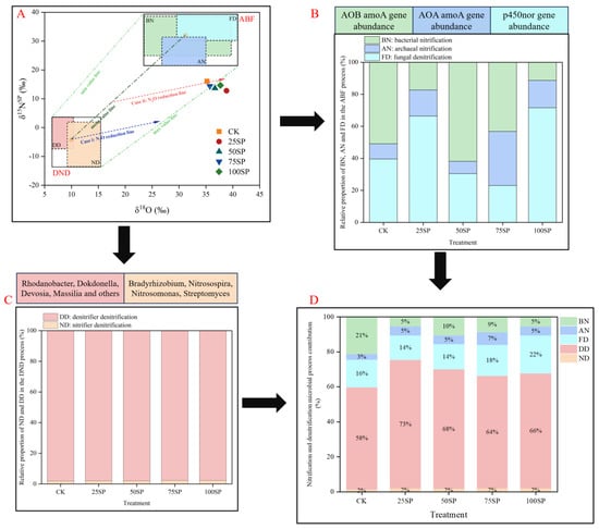 Dual−isotope map of δ18O vs. δ15NSP (A); relative proportion of BN, AN, and FD in the ABF process (B); relative proportion of ND and DD in the DND process (C); and relative contribution of BN, AN, FD, ND, and DD (D).
