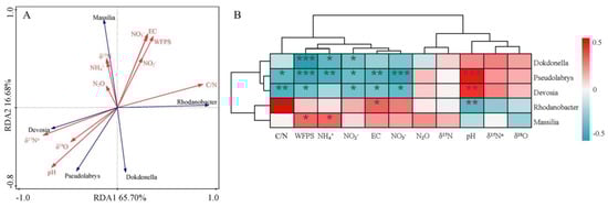 Redundancy analysis (RDA) explained 82.38% of the correlation between the microbial communities and physicochemical properties; C/N, EC, NO3−, and the WFPS were the main explanatory factors of the microbial communities. The Rhodanobacter was significantly positively correlated with C/N and EC and significantly negatively correlated with the pH, and the Dokdonella was significantly negatively correlated with NH4+, the WFPS, and NO2−. Correlation heat map analysis further confirmed these results. Meanwhile, the Massilia was significant positively correlated with NH4+ and the WFPS (Figure 5B, p < 0.05). Remarkably, microbial genera were not correlated with isotope δ-values.