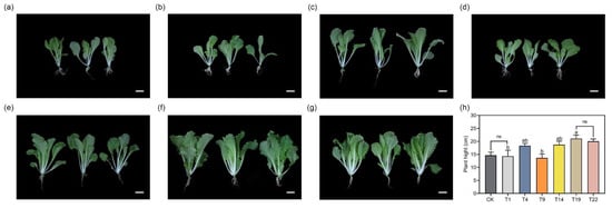 Phenotypic observations (a–g) and plant height measurements (h) of the Chinese cabbage cultivar ‘Granaat’ under greenhouse conditions. The measurement of plant height was performed 42 days after the ‘Granaat’ planting. CK represented the group without treatment (a); T1, T4, T9, T14, and T19 were treatments of plastic film covering (b); calcium cyanamide at 90 g/m2 (c); chloroisobromine cyanuric acid at 4.5 g/m2 (d); dazomet at 37.5 g/m2 (e); and ammonium bicarbonate at 150 g/m2 (f) (22 ± 2 °C day/18 ± 2 °C night, 16 h photoperiod with 300 µmol·m−2·s−1). T22 was a 150 g/m2 ammonium bicarbonate treatment (g) conducted at higher temperatures (32 ± 2 °C day/18 ± 2 °C night, 16 h photoperiod with 300 µmol·m−2·s−1). Scale bars, 4 cm. Bars represent the means ± SEM (n = 3). The ns represents no significance (Student’s t-test). Different letters indicate samples with statistical differences (p < 0.05, Duncan’s test).