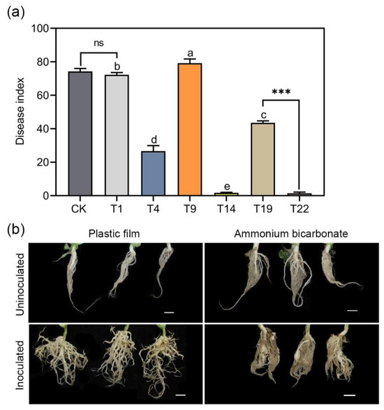 Evaluation of disease index (DSI) in Chinese cabbage cultivar ‘Granaat’ under different treatments (a) and observation of root phenotypes in both uninoculated and Plasmodiophora brassicae-inoculated plants exposed to plastic film covering and ammonium bicarbonate treatments (b) in greenhouse conditions. The experiments were performed 42 days after ‘Granaat’ planting. CK represents the group without treatment; T1, T4, T9, T14, and T19 were the treatments of plastic film covering, calcium cyanamide at 90 g/m2, chloroisobromine cyanuric acid at 4.5 g/m2, dazomet at 37.5 g/m2, and ammonium bicarbonate at 150 g/m2, respectively (22 ± 2 °C day/18 ± 2 °C night, 16 h photoperiod with 300 µmol·m−2·s−1). T22 was a 150 g/m2 ammonium bicarbonate treatment conducted at higher temperatures (32 ± 2 °C day/18 ± 2 °C night, 16 h photoperiod with 300 µmol·m−2·s−1). Bars represent the means ± SEM (n = 3). The ns and asterisks represent no significance and significant differences (*** p < 0.001, Student’s t-test), respectively. Different letters indicate samples with statistical differences (p < 0.05, Duncan’s test). Scale bars, 1 cm.