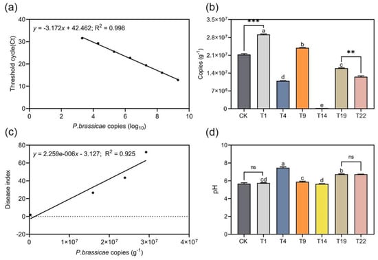 Analysis of the standard curve (a), copies of P. brassicae resting spores in soil (b), correlation between the P. brassicae resting spore density in soil and the DSI (c), and soil pH (d) under greenhouse conditions. The quantification of P. brassicae resting spores in soil and measurement of soil pH were performed after 14 days of treatment and ventilated for 7 days. A correlation analysis was performed with the treatments of dazomet, calcium cyanamide, ammonium bicarbonate, and plastic film covering (from left to right). CK represents the group without treatment; T1, T4, T9, T14, and T19 were treatments of plastic film covering, calcium cyanamide at 90 g/m2, chloroisobromine cyanuric acid at 4.5 g/m2, dazomet at 37.5 g/m2, and ammonium bicarbonate at 150 g/m2, respectively (22 ± 2 °C day/18 ± 2 °C night, 16 h photoperiod with 300 µmol·m−2·s−1). T22 was a 150 g/m2 ammonium bicarbonate treatment conducted at higher temperatures (32 ± 2 °C day/18 ± 2 °C night, 16 h photoperiod with 300 µmol·m−2·s−1). Bars represent the means ± SEM (n = 3). The ns and asterisks represent no significance and significant differences (** p < 0.01, *** p < 0.001, Student’s t-test), respectively. Different letters indicate samples with statistical differences (p < 0.05, Duncan’s test).
