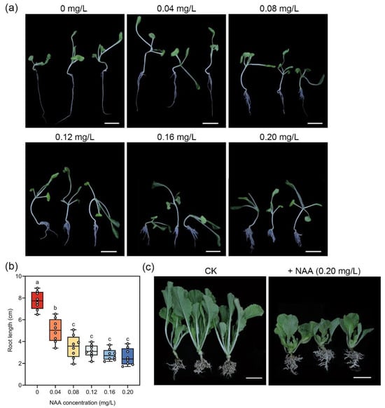 Observations of ‘Granaat’ phenotypes in MS media with different concentrations of NAA (a), measurement of root length (b), and an analysis of the root phenotypes of ‘Granaat’ infected by P. brassicae under greenhouse conditions (c). The cultivation conditions for ‘Granaat’ in MS media included a light intensity of 2250 lx in a growth chamber, a photoperiod of 16 h, and a temperature of 25 ± 1 °C, and phenotypes were observed two weeks after seeding. A root phenotype analysis was performed 42 days after ‘Granaat’ planting. Different letters indicate samples with statistical differences (p < 0.05, Duncan’s test). Scale bars in (a) and (c), 2 cm and 4 cm, respectively.