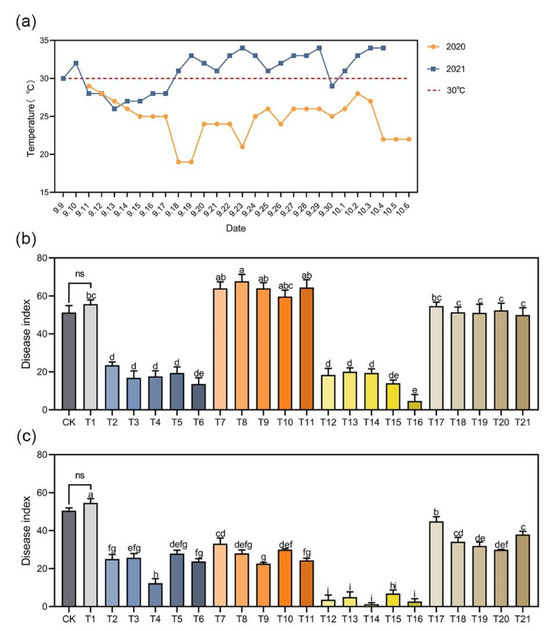 Meteorological data in the treatment period (a), and DSIs of the ‘Granaat’ subjected to different treatments for clubroot control in the yield trials in 2020 (b) and 2021 (c). CK represents the group without treatment; T1 was the plastic film covering treatment; T2 to T6 were treated with calcium cyanamide at rates of 60, 75, 90, 105, and 120 g/m2, respectively; T7 to T11 were treated with chloroisobromine cyanuric acid at rates of 1.5, 3.0, 4.5, 6.0, and 7.5 g/m2, respectively; T12 to T16 received dazomet at rates of 27.5, 32.5, 37.5, 42.5, and 47.5 g/m2, respectively; and T17 to T21 were treated with ammonium bicarbonate at rates of 120, 135, 150, 165, and 180, respectively. Different letters indicate samples with statistical differences (p < 0.05, Duncan’s test).